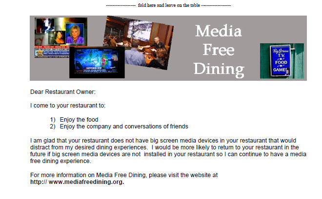 It’s difficult to tell a restaurant owner that the big screen tv(s) all over the restaurant are just distracting from your experience to enjoy the food, company and conversation. To help leave a simple yet powerful message for the restaurant owner, we have created two simple message cards that you can leave on the table that either expresses a positive feedback that you enjoyed the media free dining experience or feedback that the media devices distracted from your dining experiences.